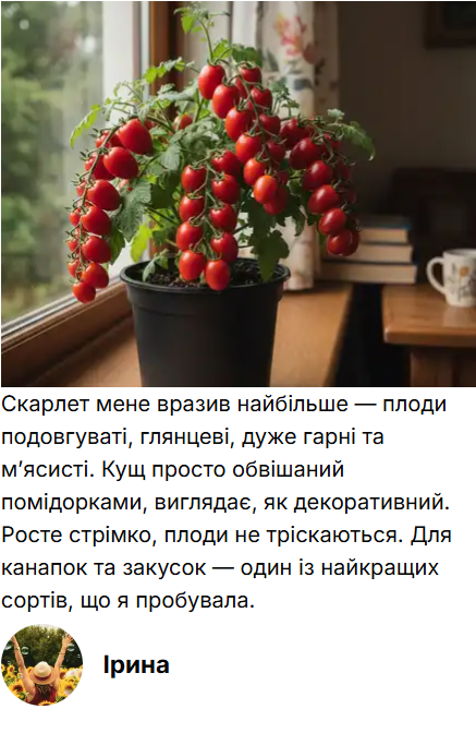 Скарлет — ранній черрі з продовгуватими, “сливковими” плодами, які виглядають ефектно й формують дуже рясні грона. Кущ компактний, міцний, добре тримає форму та швидко входить у плодоношення, що робить його одним із найурожайніших для кімнатного вирощування. Томатики яскраво-червоні, глянцеві, м’ясисті, майже не тріскаються й довго висять на кущі без псування.